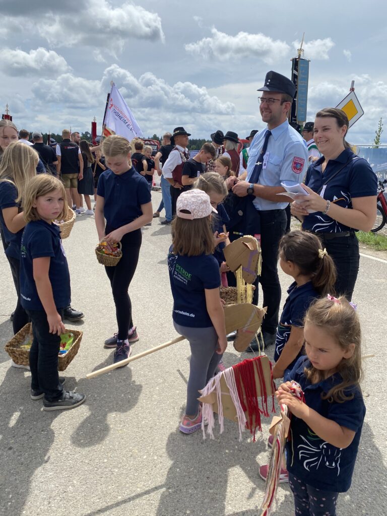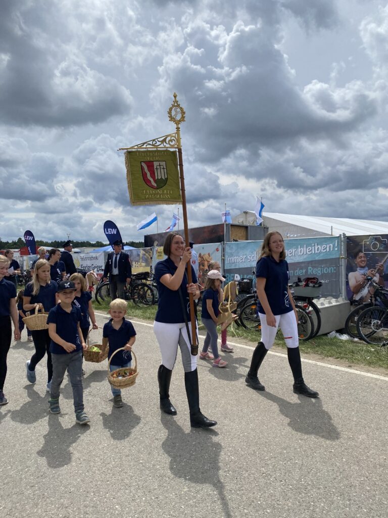Bei strahlendem Sommerwetter setzte sich der Umzug in Bewegung. Besonders stolz waren wir auf unsere Fahnenabordnung, die von unseren engagierten Pferdekids mit ihrem liebevoll gestalteten Holzpferd sowie weiteren Vereinsmitgliedern begleitet wurde. Die Kinder waren mit großer Begeisterung dabei und verteilten fleißig Gummibärchen und Flyer an die zuschauenden Kinder am Straßenrand – in der Hoffnung, auch künftig neue Nachwuchsmitglieder für unsere jüngste Vereinsgruppe zu gewinnen.